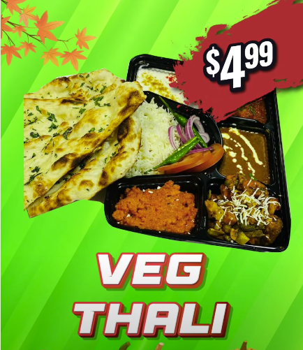 $4.99 Veggie Thali available everyday at Indian Frootland!