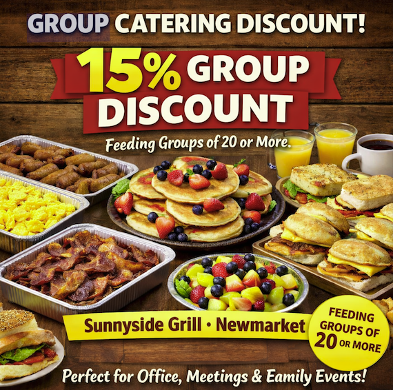 Sunnyside Grill is now offering a 15% group discount on dine-in, for groups of 20 or more!