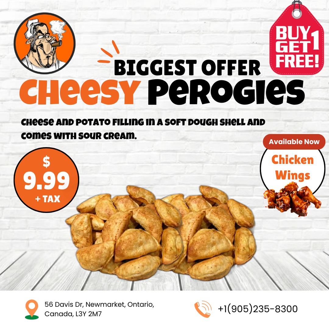 CHEESE AND POTATO FILLING IN A SOFT DOUGH SHELL. COMES WITH SOUR CREAM.