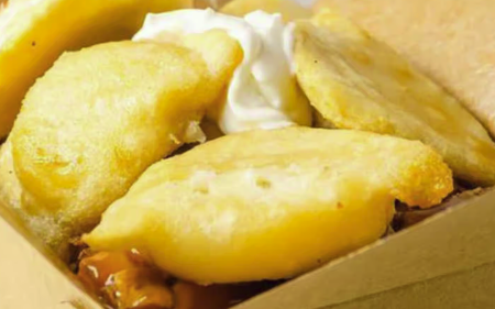 Fresh-cut fries topped with cheese perogies, and bacon.