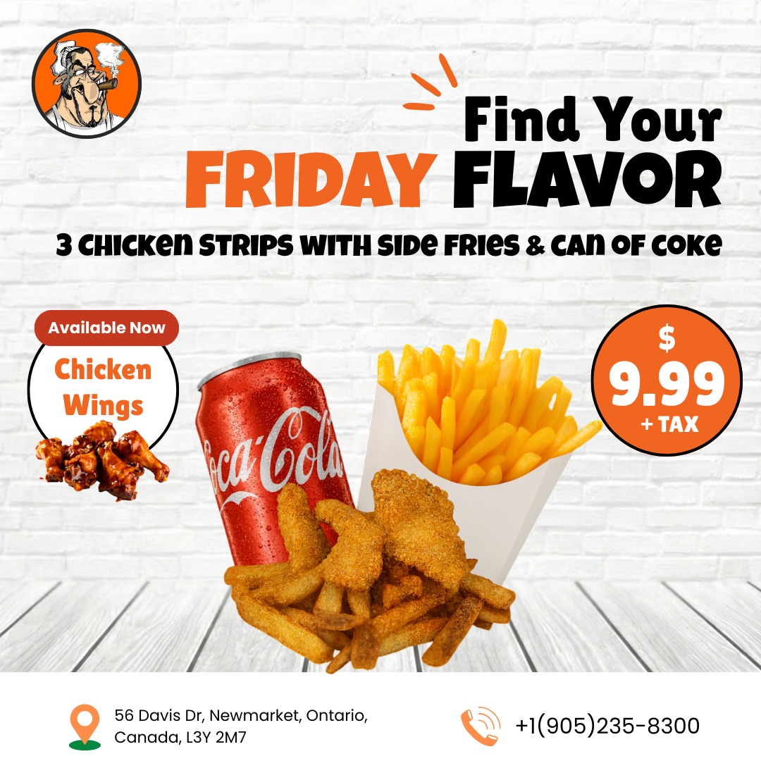 3 CHICKEN STRIPS, SIDE FRIES & CAN OF COKE FOR ONLY $9.99 + tax