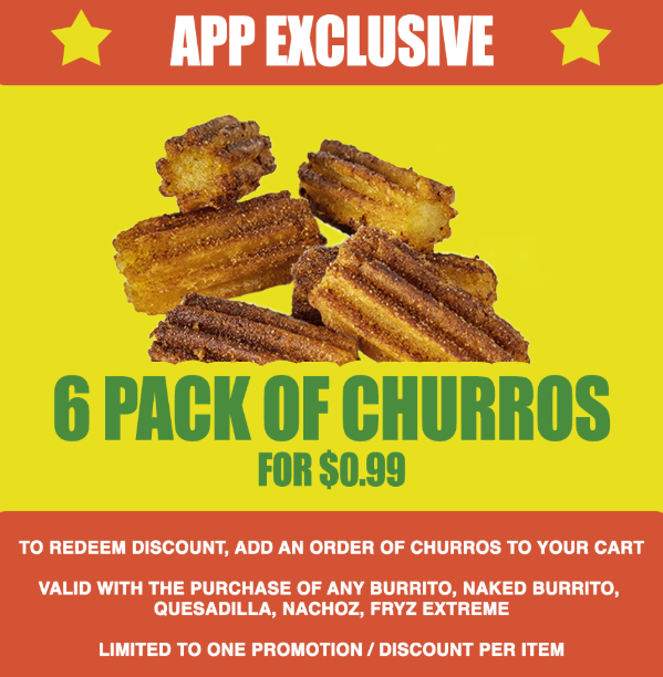 6 PACK OF CHURROS FOR $0.99 TO REDEEM DISCOUNT, ADD AN ORDER OF CHURROS TO YOUR CART VALID WITH THE PURCHASE OF ANY BURRITO, NAKED BURRITO, QUESADILLA, NACHOZ, FRYZ EXTREME LIMITED TO ONE PROMOTION / DISCOUNT PER ITEM