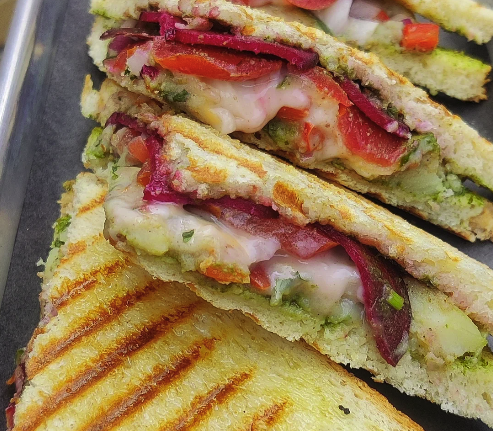 Mumbai street food staple. Spiced potato mix, veggies (cucumber, beets, bell peppers, tomato) layered inside pullman loaf slices with mozzarella, aged cheddar, spicy mint chutney and butter. Grilled to perfection!