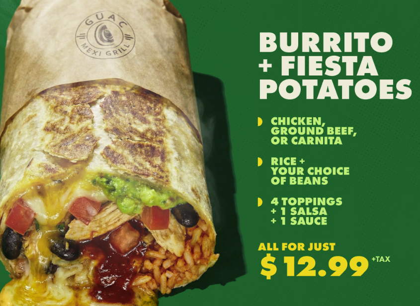 Burrito + Fiesta Potatoes for just $12.99 + tax!