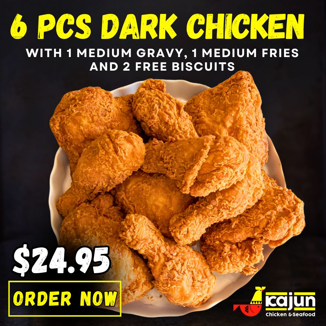 6 Pieces Dark Chicken with 1 medium gravy, medium fries and 2 free biscuits.