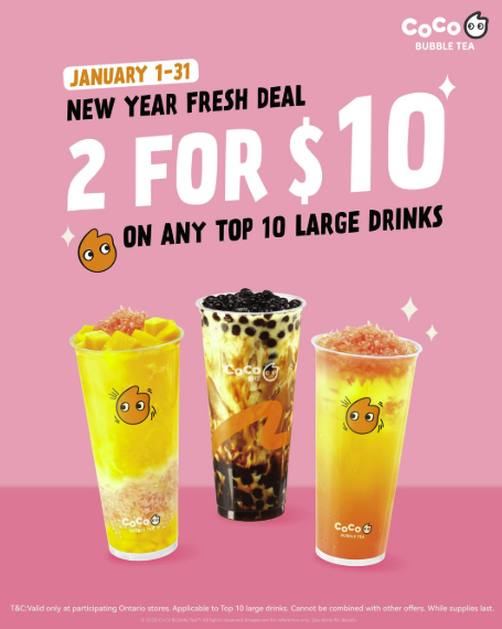 🧋✨ New Year, New Sips ✨🧋 Because one bubble tea is never enough 👀💭 Try CoCo’s Top 10 Drinks — double the joy all month long! 🧋🧋 📅 Jan 1–31 🥤 2 Large Drinks for $10 📍 Available at participating CoCo Ontario stores only Who are you bringing for your second cup? 👯♀️