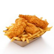 Juicy and delicious chicken tenders (2 pieces), golden crispy fries, choice sauce