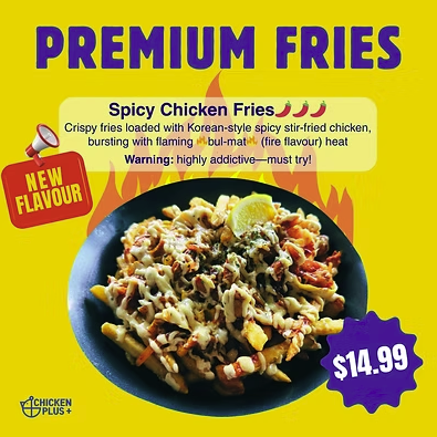 Spicy Chicken Fries! Crispy fries loaded with Korean-style spicy stir-fried chicken, bursting with flaming bul-mat (fire flavour)h eat. Warning - Highly addictive - must try!