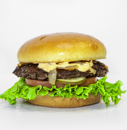 BEEF PATTY, CHEDDAR CHEESE, LETTUCE, TOMATOES, PICKLES, GRILLED ONIONS AND BRO SAUGE