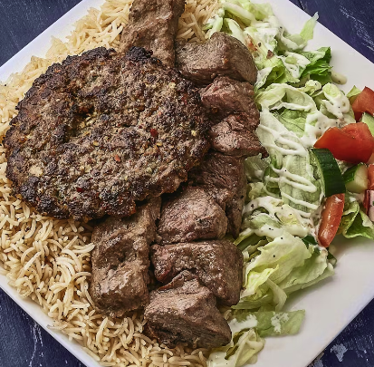 Served with salad & a choice of rice (gf), fries, or naan bread. For $15.99