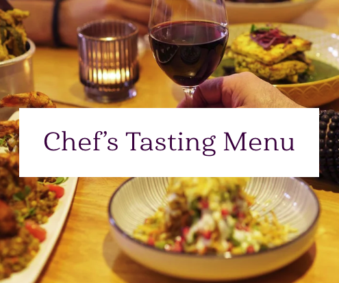Chef’s South Indian Tasting Menu $59 per guest | minimum two guests | full table participation required no substitutions | tax and service additional ~ snack ~ Batata Vada potato fritters, tomato chutney ~ fish ~ Kerala Scallops & Prawns tangy coconut curry ~ main ~ Chicken Chettinad tamarind, mustard seeds, coconut, curry leaf Beans Poriyal pan-tossed green beans ~ sweet ~ Paal Payasam south Indian rice pudding