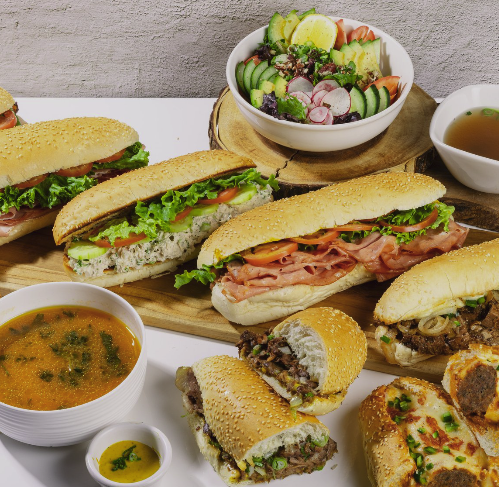 Gourmet Sandwiches: $16 ea Bourdain Anthony Bourdain's favourite sandwich: A savoury delight mortadella with provolone, mayo and house mustard Brisket Philly Cheese (best seller) Chopped Brisket in gravy with melted cheese and sautéed onions our take on the famous sandwich. Caprese (vegetarian) Fresh basil mozzarella slices, Balsamic glaze, arugula, pickled onion Chicken Grilled chicken in chimichurri with creamy cucumber slaw Meatball Beef meatballs/Tomato sauce/shredded cheese/and diced jalapeños Three Italian Italian ham trio: Soppresata, Mortadella and Prosciutto with Provolone, lettuce, and tomato Turkey Club The ultimate turkey club satisfying combo of turkey, bacon, lettuce and tomato with light mayo Vegan Hummus, roasted red peppers, zucchini, and a delightful spread of pistachio butter with kettle chips
