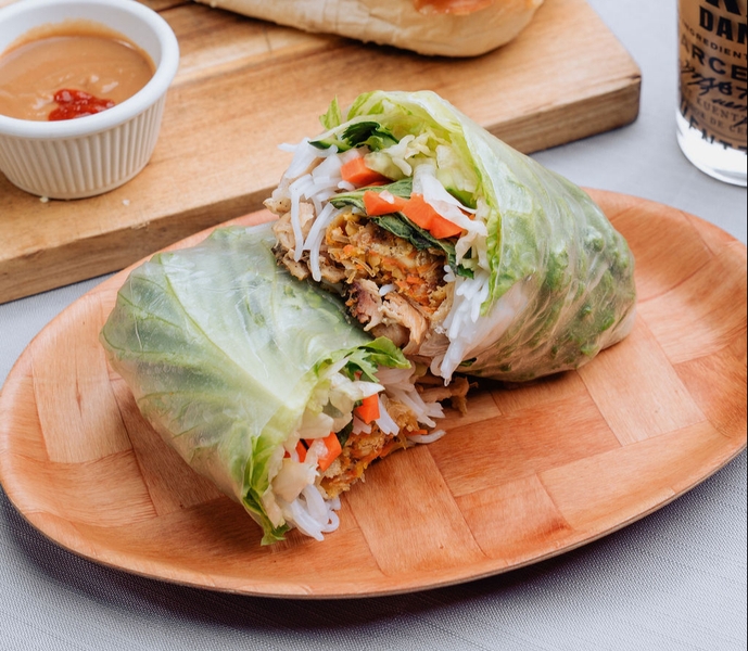Fresh Mint, lettuce, coriander, mint, vermicelli, deep fried veggie spring roll with your choice of chicken or tofu (vegan).