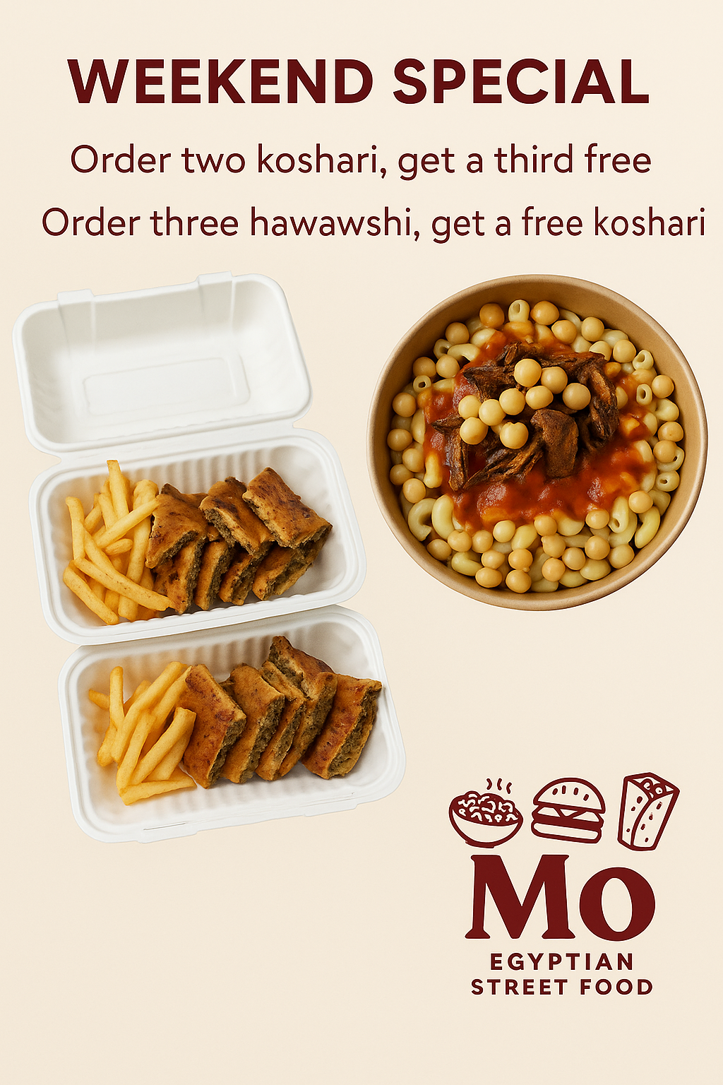 π Weekend Special Offer β Limited Time! π π Koshari Deal Buy 2 Koshari bowls and get the 3rd one FREE! Perfect for sharing the taste of Egypt with friends and family! π₯ Hawawshi Combo Order 3 Hawawshi sandwiches and get a FREE Koshari bowl on the house! Because nothing says βweekend feastβ like a little extra flavor π π Available Friday β Saturday β Sunday π Delivery in Downtown Toronto β° Orders must be placed 24h in advance β