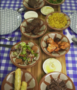 Try a little bit of: Chicken and Beef Shawarma, Shish Tawook, Beef Cubes, Cheese Rolls, Kibbe, Fattoush, Tabbouli, Humus, and Garlic