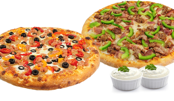 PICKUP SPECIAL 2 Large 3 Topping Pizzas + 4 Dips