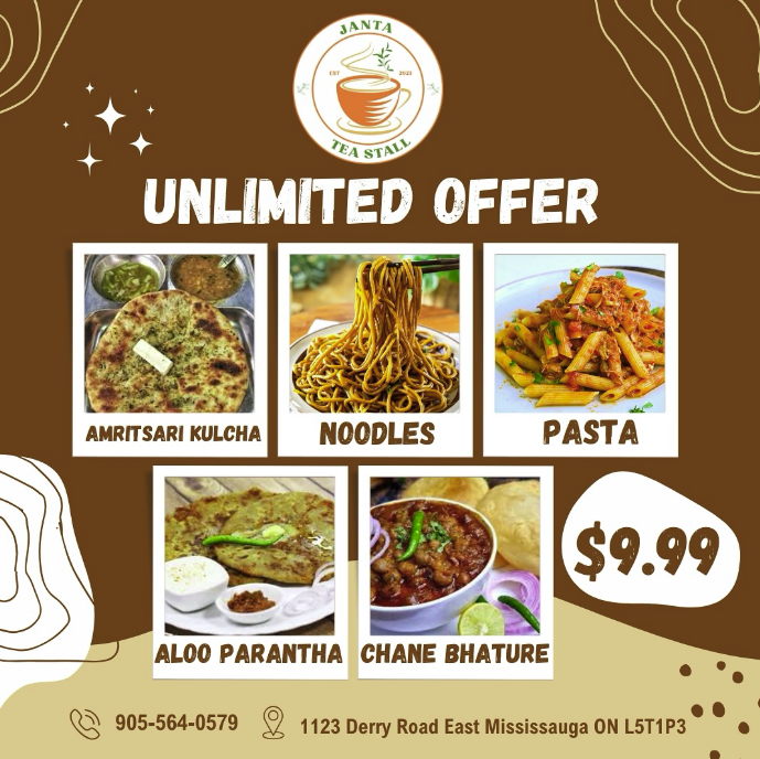 Indulge in unlimited flavors at Janta Tea Stall in Mississauga! Enjoy mouthwatering Unlimited $9.99 deals on Noodles, Pasta, Amritsari Kulcha, Aloo Parantha, and Cholle Bhature. Don’t miss out on this delicious feast! 🍜🥟✨