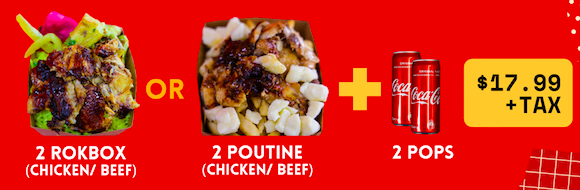 Special Offer: 2 Rok Box or 2 Poutine + 2 Pops only $17.99 + tax! Choose from Chicken or Beef.