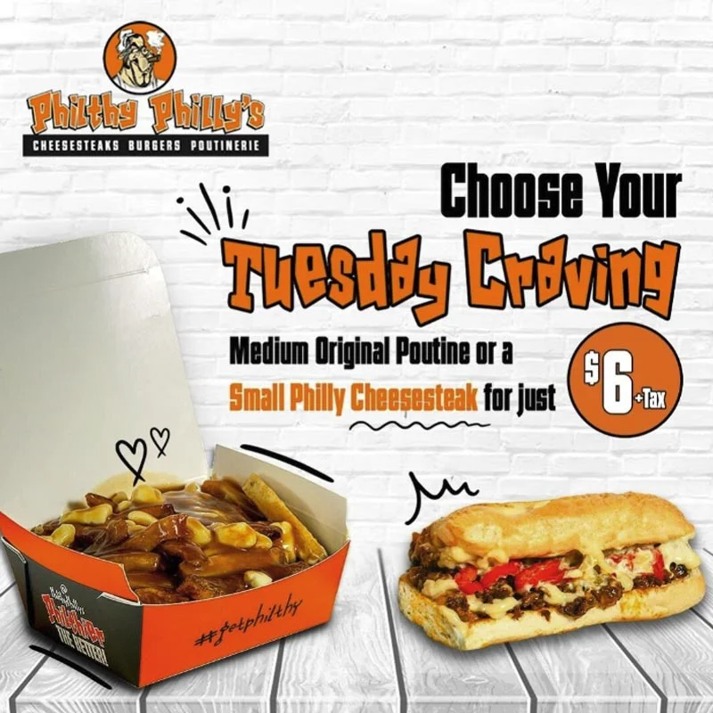 Craving an afternoon snack? Slide into Choose-Day Tuesday at Philthy Philly’s and treat yourself to a mid-day bite that hits different. 😋🔥 Medium Original Poutine OR Small Philly Cheesesteak For just $6!
