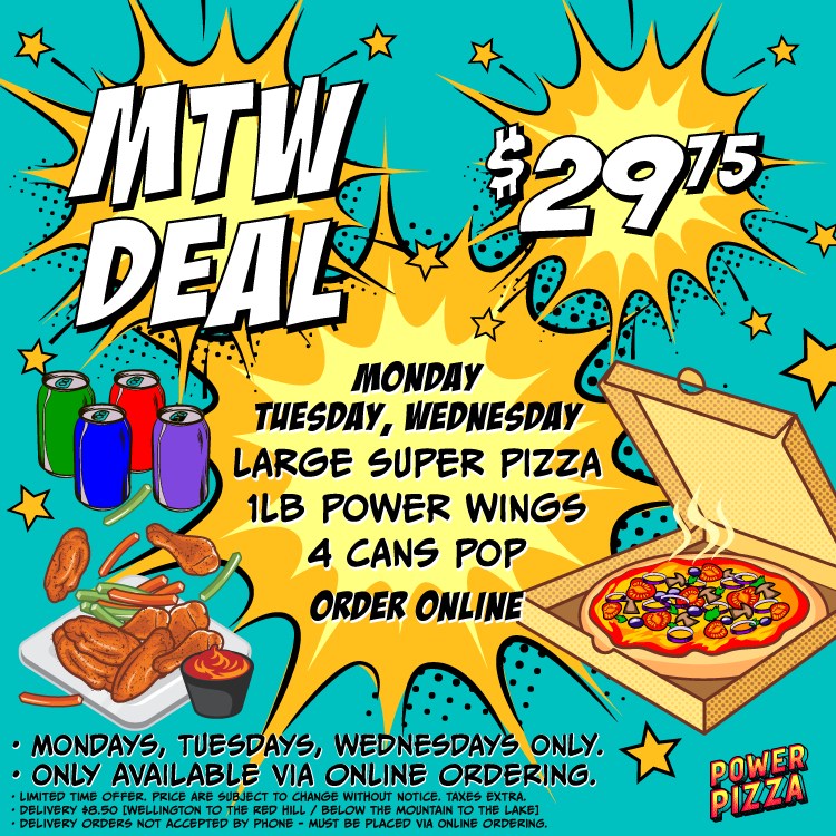 Don't miss out on the MTW Deal! LARGE SUPER PIZZA 1 POUND OF WINGS 4 CANS OF POP Only $29.75 • MONDAYS, TUESDAYS, WEDNESDAYS ONLY. • ONLY AVAILABLE VIA ONLINE ORDERING. • Taxes and delivery extra.