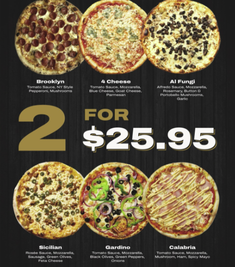 Happy Holidays! ππCome try our new Menu items and take advantage of this great new 2 Pizza Deal! Walk in, Take Out or Dine In! Enjoy with a glass of wine, beer or any of our coolers π» π· 2 Pizzas for $25.95 Choose any 2 pizzas from:
