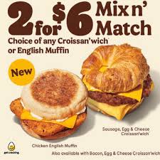 In Canada, Burger King is offering $2 for $6 Mix n' Match for Breakfast Choice of any Croissan'wich or English Muffin: Availability: The promotion is available everyday while breakfast is served. Location: The offer is available at participating locations across Canada, but some promotions may be specific to certain franchises.