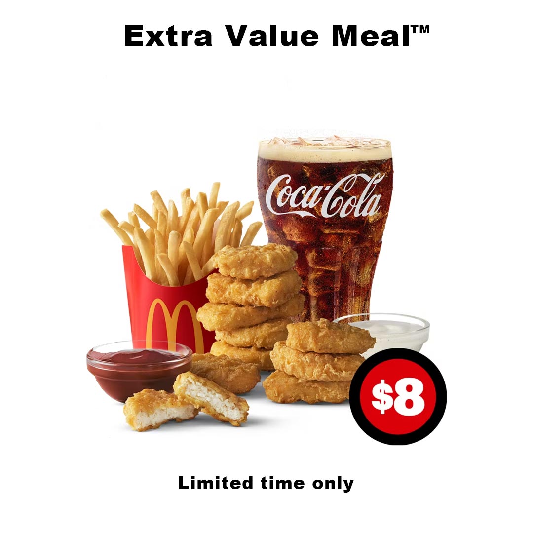 Make it an Extra Value Meal™ and save* Enjoy an $8 10 Piece McNuggets® Meal for a limited time only. Plus, pick from other favorites like a Quarter Pounder®^ with Cheese Meal, Big Mac® Meal, or McCrispy® Meal with a medium Fries and soft drink.