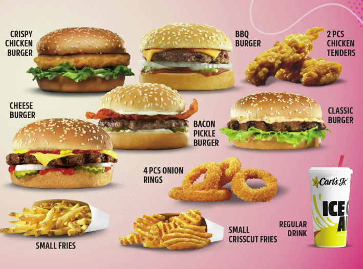 Carl's Jr. Student Meal Deals...Starting at only $8.90 Combo A: $8.90 1 x Burger 1 x 4 pcs Onion Rings 1 x Small Fries 1 x Regular Drink Combo B: $9.90 1 x Burger 3 x Sides 1 x Regular Drink
