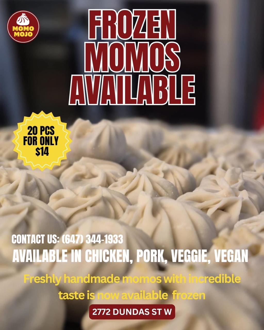 Frozen Momos 2 Go available at Momo Mojo! 20 pieces for only $14! Choose from: Fresh handmade momos with incredible taste are now available frozen. Please call 647-344-1933 to order or visit us at 2772 Dundas St. W