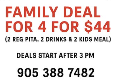 FAMILY DEAL FOR FOUR Only $44 + tax ENJOY 2 REGULAR PITAS + 2 DRINKS + 2 KIDS MEALS FOR JUST $44 + TAX Perfect for family dine-ins or takeout tasty, fresh, and value-packed! Deals Start After 3 pm.