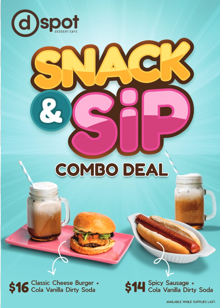 Snack & Sip Combo Deal starting at only $14! Spicy Sausage + Cola Vanilla Dirty Soda - $14 Classic Cheese Burger + Cola Vanilla Dirty Soda - $16