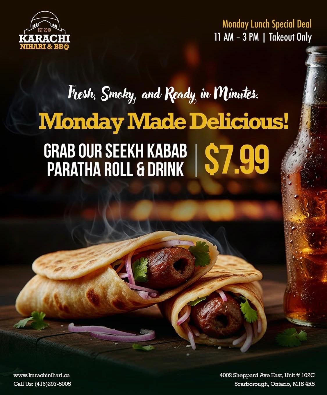 Seekh Kabab Paratha Roll & Drink only $7.99! Monday Made Delicious! Monday Lunch Special Deal - Valid from 11 am - 3 pm. Take out only.