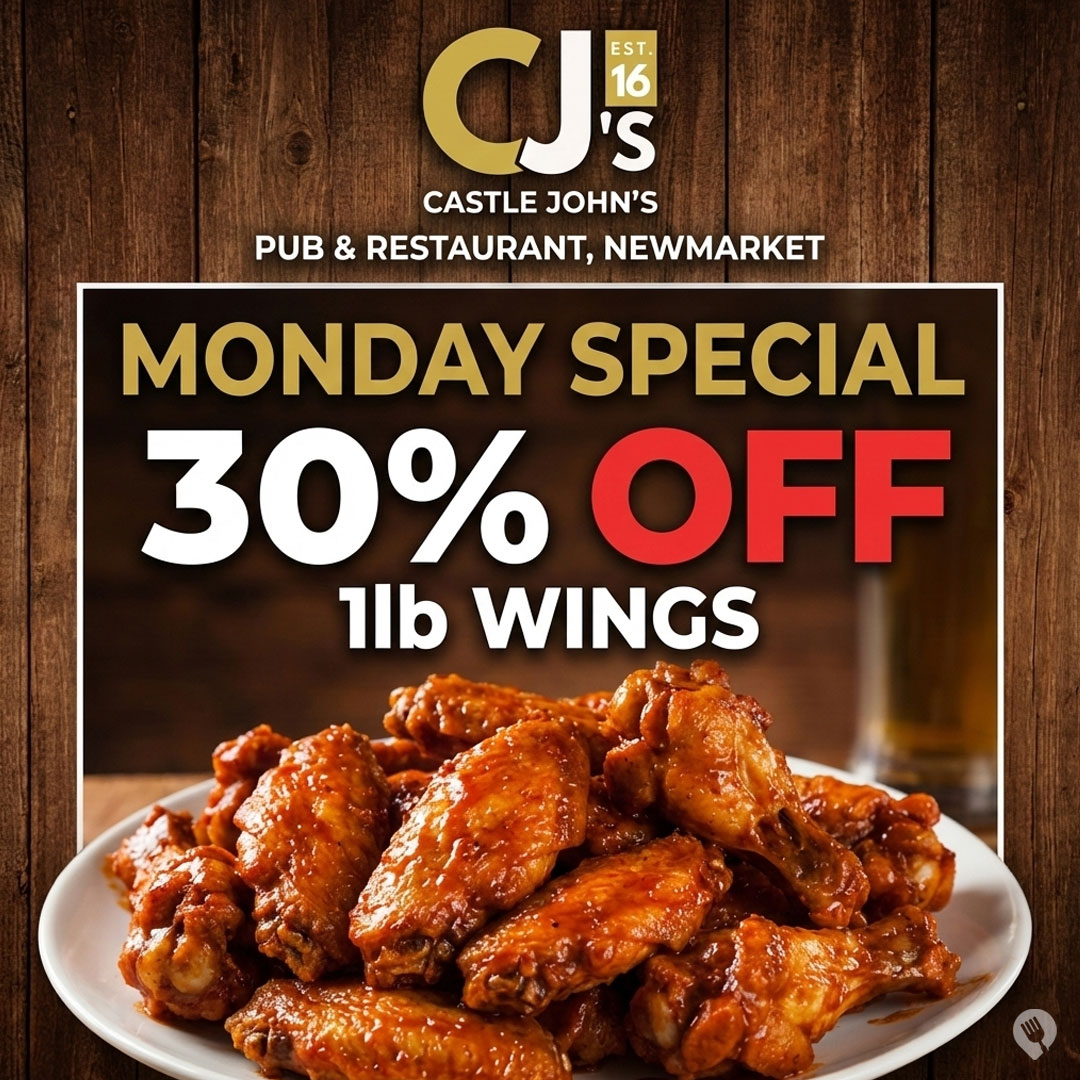 Monday Special Mondays just got tastier at Castle John’s Pub and Restaurant in Newmarket! Enjoy 30% off our famous 1lb wings, perfectly seasoned and cooked to crispy perfection. Choose from a variety of sauces and pair them with your favourite drink for the perfect start to the week. 🍗 Dine in and enjoy the warm pub atmosphere or grab them to go — either way, it’s a wing night you don’t want to miss! 📍 Available every Monday at Castle John’s Pub & Restaurant, Newmarket.