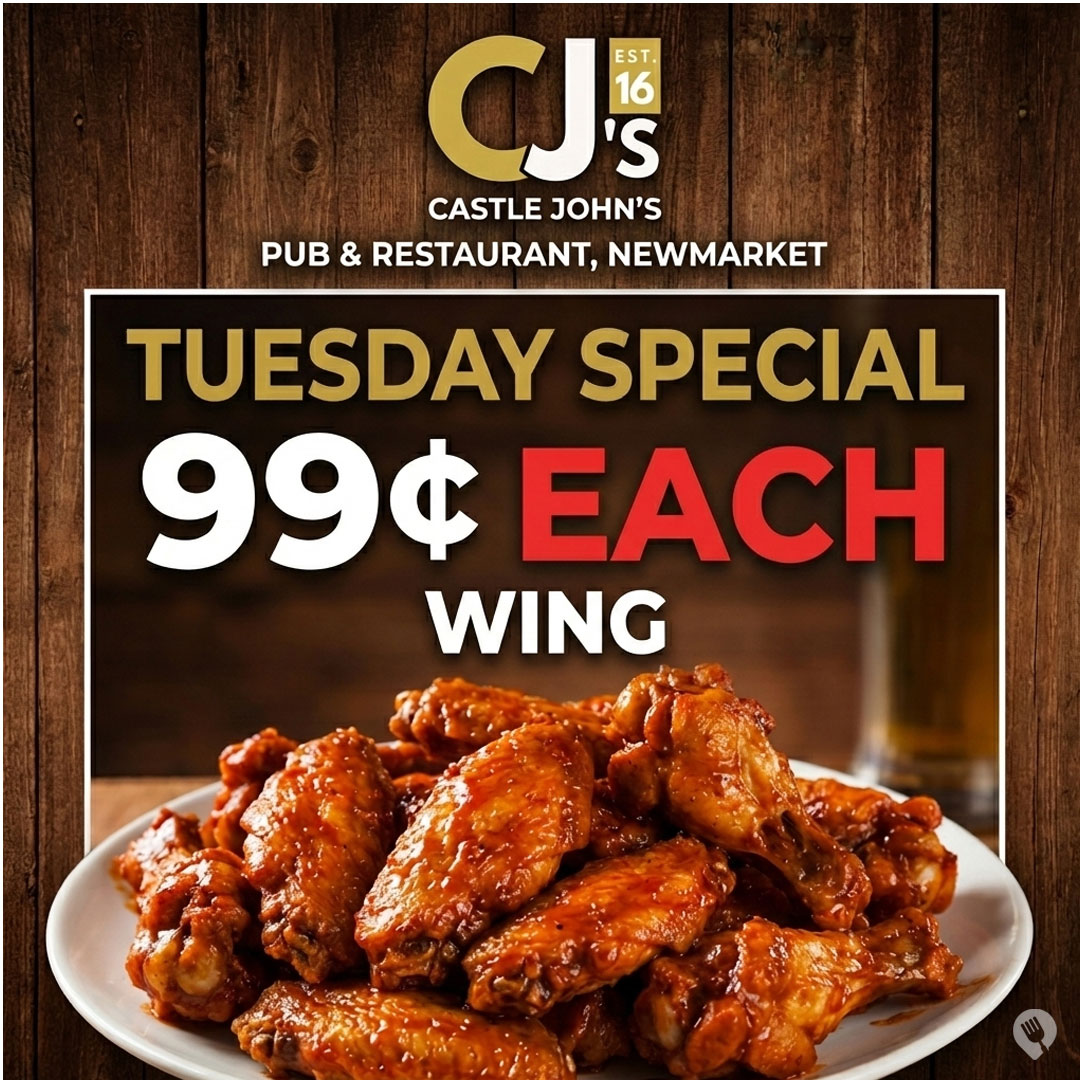 Tuesday Special Tuesdays are for wings! 🍗 Head to Castle John’s Pub & Restaurant in Newmarket and enjoy famous wings for only 99¢ each with the purchase of a drink. Choose your favourite sauces — from mild to blazing hot — and make it a perfect night out with friends, cold drinks, and great vibes. 🔥 Dine-in only. Drink purchase required. Minimum order may apply. 📍 Every Tuesday at Castle John’s Pub & Restaurant, Newmarket.