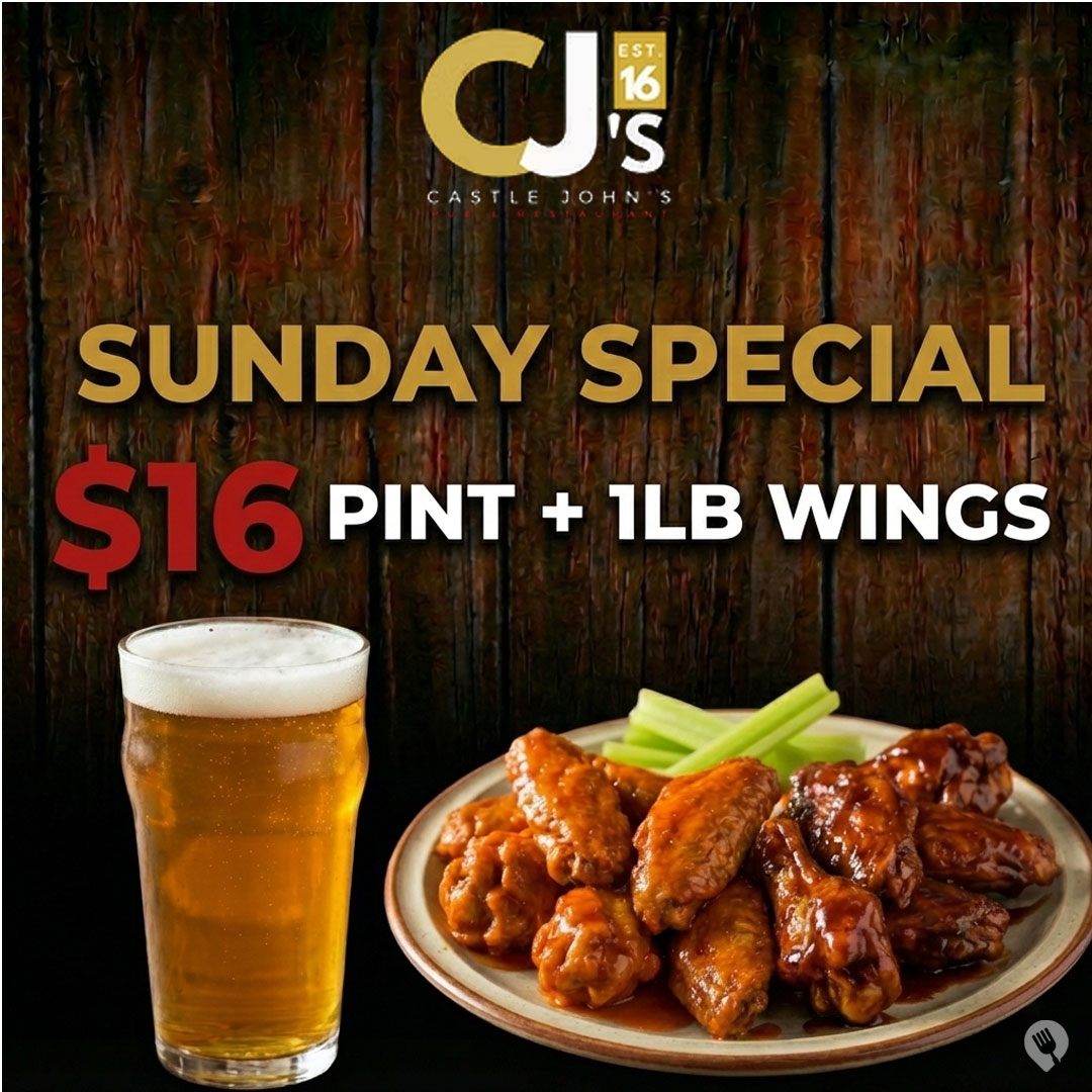 Sunday Special Sundays are for good food and cold pints 🍺 Join us at Castle John’s Pub & Restaurant in Newmarket and enjoy a pint of your choice with 1lb of our famous wings for only $16! The perfect way to wrap up the weekend with friends, sports, and great vibes. 🔥 Dine-in only. Drink purchase included. 📍 Every Sunday at Castle John’s Pub & Restaurant, Newmarket.