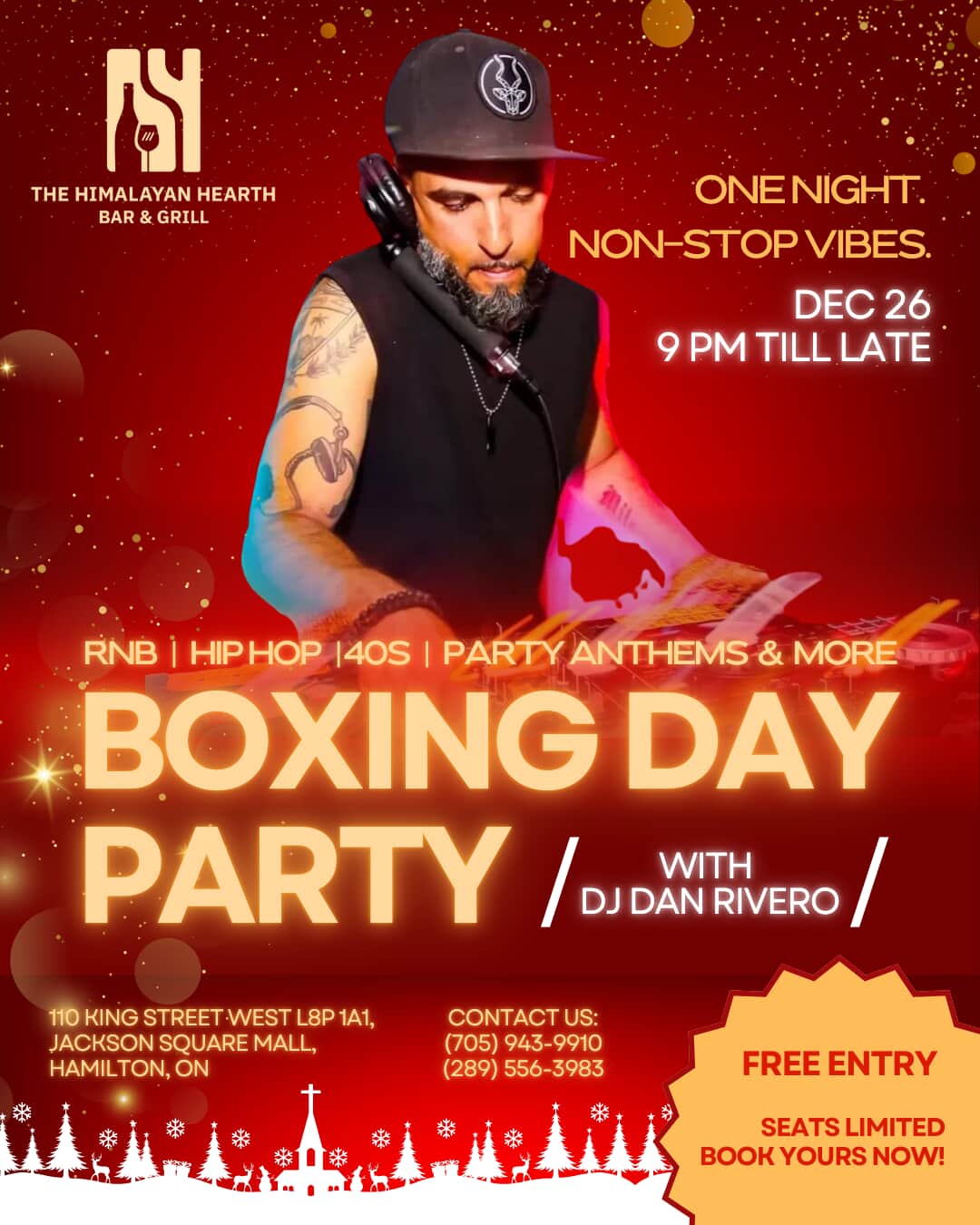 Boxing Day Party One Night. Non-stop Vibes. DJ Dan Rivero Spinning RNB | Hip Hop | Party Anthems & More! FREE ENTRY! Limited seating. Book your table today! Contact us at 289-556-3983 or visit us The Himalayan Hearth, located in Jackson Square with an entrance on King Street W.
