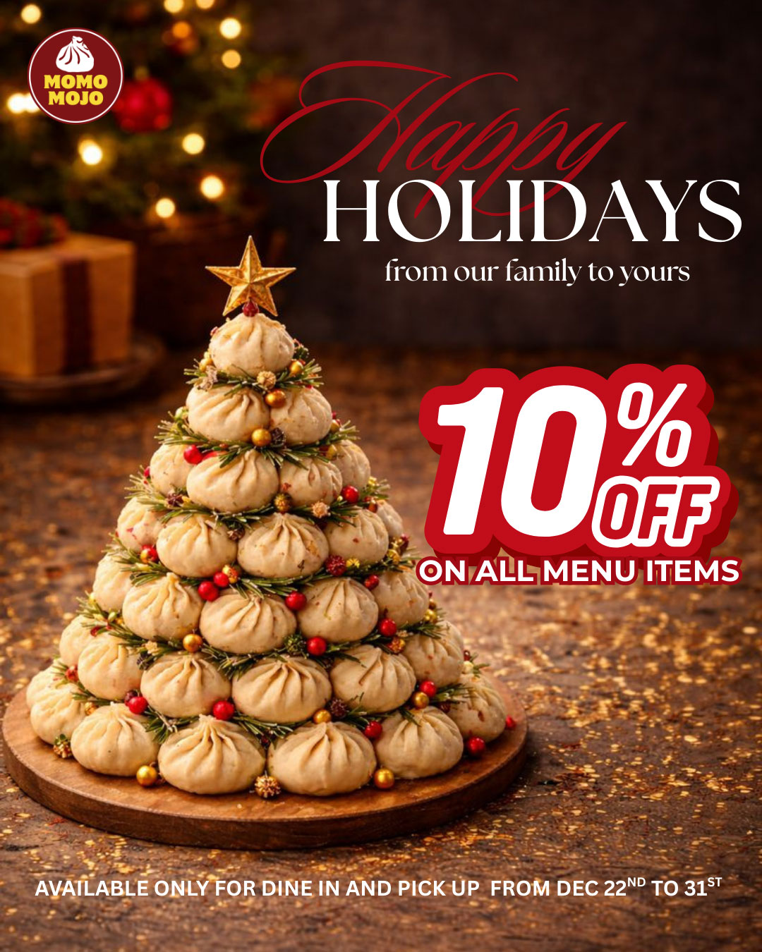 Celebrate the holidays with 10% OFF all menu items at Momo Mojo! From our family to yours, enjoy your favourite momos and dishes at a festive discount. ✨ Offer Details: • 10% off the entire menu • Valid for dine-in and pick-up only • Available December 22nd to December 31st • Perfect for holiday gatherings, cozy dinners, or end-of-year treats Make your holidays delicious and save while you celebrate! 🎁🥟
