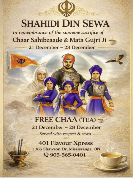 With deep respect and humility, we observe Shahidi Din in remembrance of the supreme sacrifice of Chaar Sahibzaade & Mata Gujri Ji π From 21 December to 28 December, 401 Flavour Xpress is offering FREE CHAA (Tea) as sewa β served with respect, remembrance, and gratitude. May their courage, faith, and sacrifice continue to inspire humanity. π 1385 Shawson Dr, Mississauga, ON β Free Chaa | 21β28 December π 905-565-0401