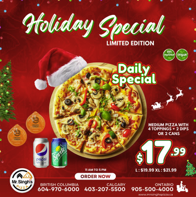 1 Pizza With 4 Toppings Comes with 2 Dips or 2 Pops. Click here to order online from Mr. Singh's Pizza Mayfield Road