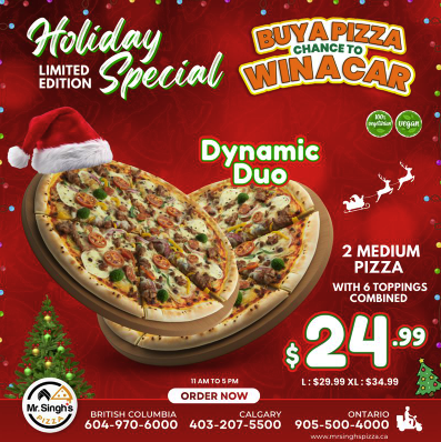 2 Pizzas With 6 Toppings Combined Click here to order online from Mr. Singh's Pizza Mayfield Road