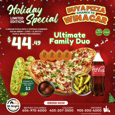 2 Medium Pizzas With 6 Toppings Combined Comes with Click here to order online from Mr. Singh's Pizza Mayfield Road