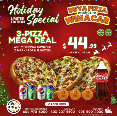 3 Pizzas With 9 Toppings Combined Comes with 3 Dips AND 4 Cans of Pop or 2L Pop Bottle. Click here to order online from Mr. Singh's Pizza Mayfield Road