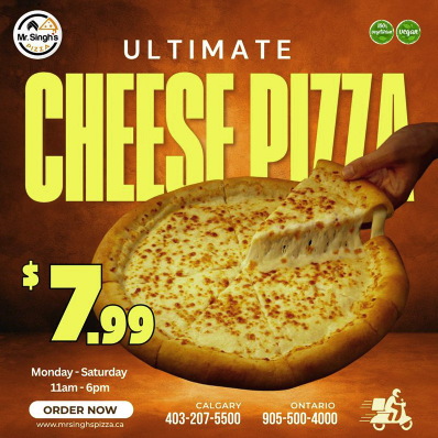 Ultimate Cheese Pizza - Medium Available Monday - Saturday between 11 AM - 6 PM. Click here to order online from Mr. Singh's Pizza Mayfield Road