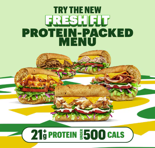 Introducing the New Fresh Fit Menu - 21+ grams of Protein under 500 Cals* A variety of protein packed subs to fuel your day. Eat fresh. Feel good.