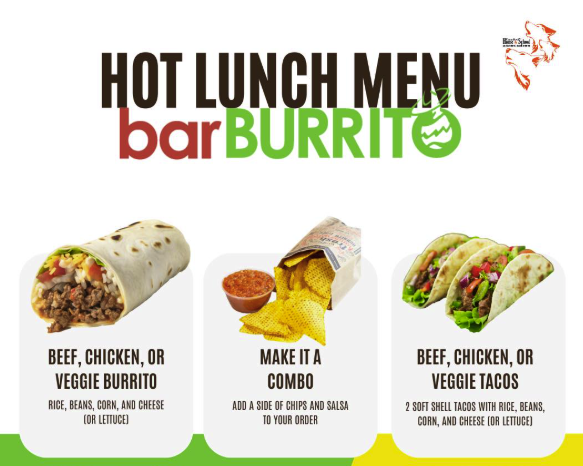 Cater your next Kids School Lunch Program at barBURRITO 57 Harry Walker Parkway South in Newmarket. Nourish the students with a healthy Mexican feast! Mini Chicken Burrito - $6.50 8" tortilla, Triple blend cheese, chicken, sour cream, lettuce, tomato. White Tortilla Small Bean Burrito - $6.50 8” tortilla black beans, lettuce, tomato, Triple blend cheese, sour cream. Cheese Quesadilla - $6.50 6" Tortilla, Triple Blend Cheese, 2oz Sour Cream on Side. 2 Chicken Soft Tacos - $7 6" Tortilla, Meat, Triple Bleno Cheese, Sour Cream, Salsa, Lettuce. 2 Ground Beef Soft Tacos - $7 6" Tortilla, Meat, Triple Bleno Cheese, Sour Cream, Mild Salsa, Lettuce. 2 Beans Soft Tacos - $7 6" Tortilla, Black Beans, Triple Blend Cheese, Sour Cream, Mild Salsa, Lettuce. 3 Chicken Soft Tacos with Chips and Salsa - $12.50 5" tortilla, meat, triple blend cheese, sour cream, mild salsa, lettuce.