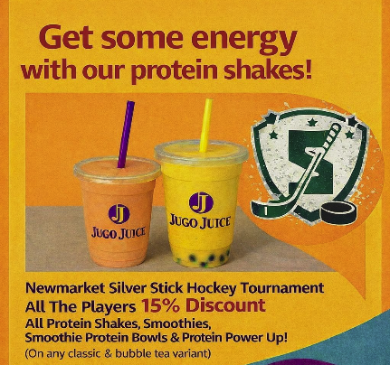 NEWMARKET SILVER STICK HOCKEY TOURNAMENT ALL PLAYERS GET 15% DISCOUNT ON ALL: Choose from a variety of healthy smoothies & freshly made healthy wraps or sandwich! FREE DELIVERY FOR ALL CATERING ORDERS OVER $200