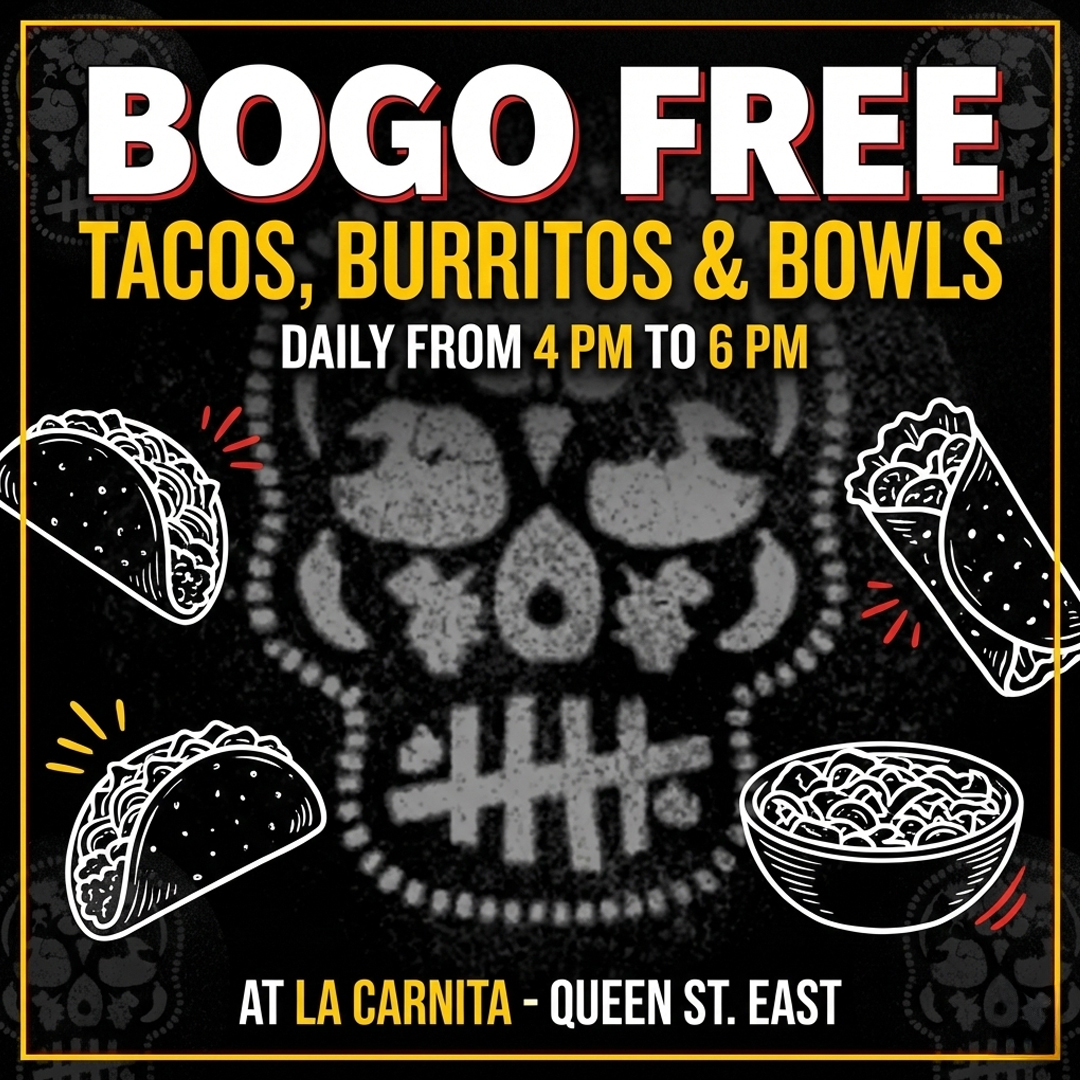 Score BOGO FREE at La Carnita – Queen St. East 🌮🔥 Every day from 4 PM – 6 PM, grab Buy One, Get One FREE on your favourites — tacos, burritos, and bowls. Perfect for after work, happy hour cravings, or bringing a friend without doubling the bill. Show up hungry, pick your combo, and enjoy twice the flavour for the price of one! 😋💥