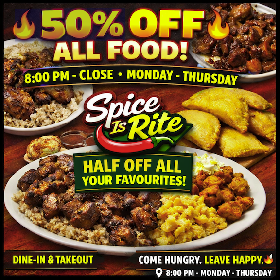 From 8 PM until CLOSE - Monday - Thursday - enjoy 50% OFF ALL YOUR FAVOURITE CHICKEN DISHES! Yes, all food. That means your favourite jerk chicken, patties, loaded plates, and late-night comfort classics are all half price.