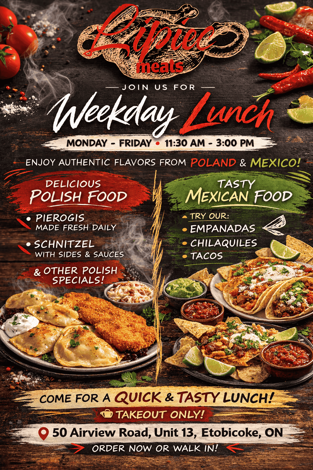 Midweek Delight! Join us for Lunch Monday to Friday, and indulge in authentic Polish pierogi and Mexican tacos.