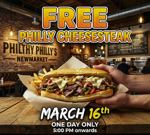 Mark your calendars, Newmarket! We’re giving away FREE Philly Cheesesteaks to the first 100 people for one day only. You don’t want to miss this legendary local feast.